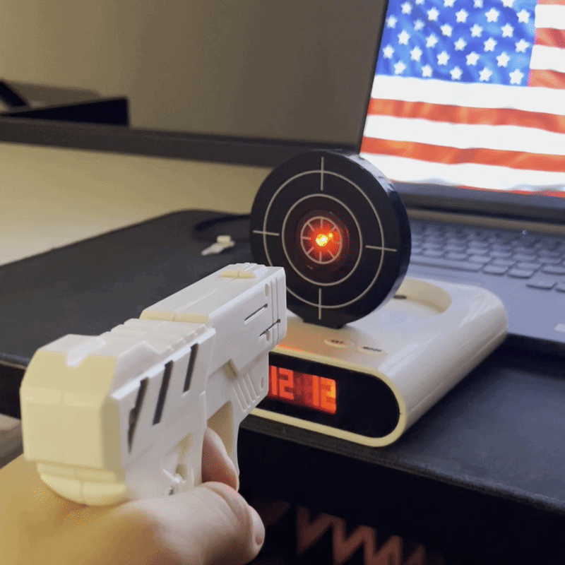 There's no tap to silence it. No swipe to delay it. The one and only way to stop Shoot Snooze is to pick up the blaster, take aim, and hit the target dead center. Keep missing? It keeps screaming. Your body has no option but to wake the hell up.